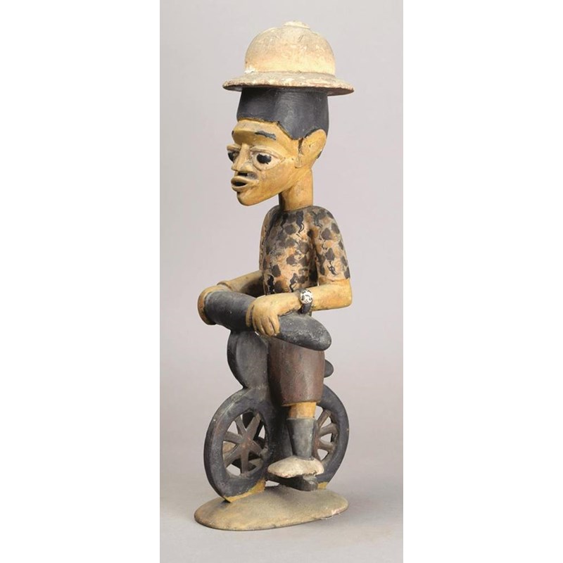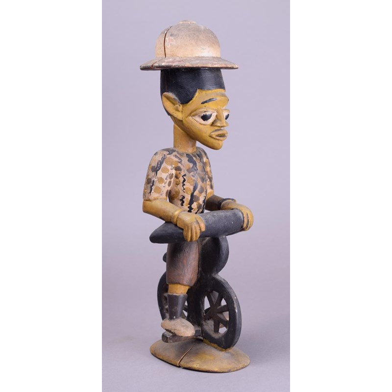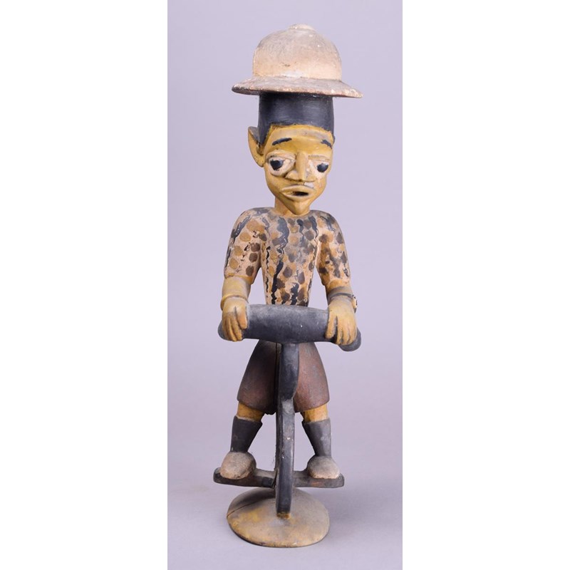 wood and paint, the figure wearing a pith helmet, polka dot shirt, a watch and shorts, sitting on a bicycle,