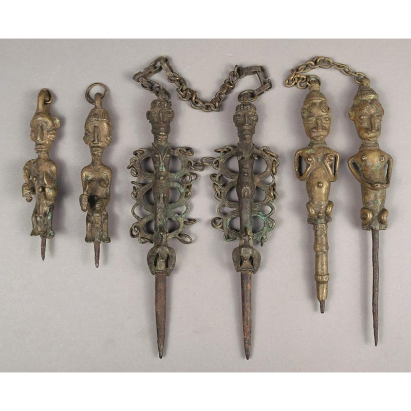 Three pairs of Yoruba Edan staffs Nigeria brass and iron