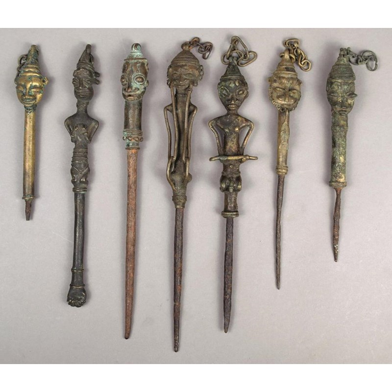 Seven Yoruba Edan staffs Nigeria brass and iron