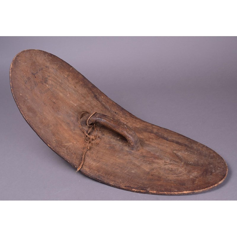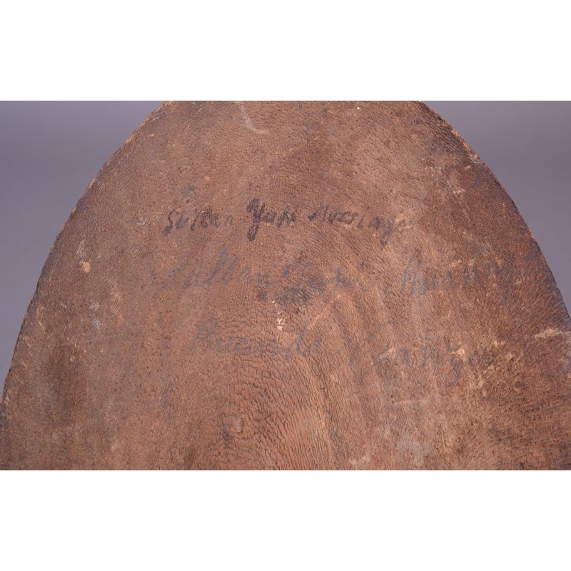 wood, curved with a central conical boss and with carved and pigment decoration, with an integral handle, the indistinctly inscribed ? Sultan Yaki Mussings,
