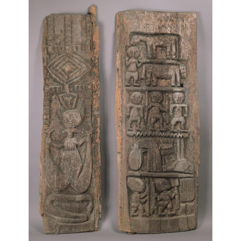 wood, carved animals, figures, a comb, a snake and the goddess Olokun,