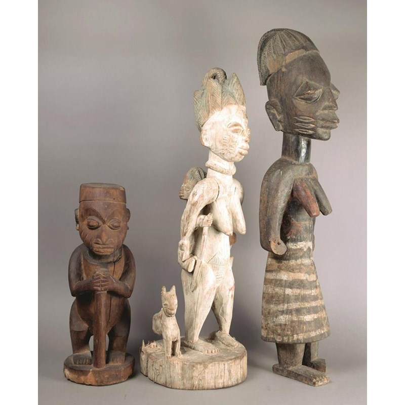 a maternal group with a child on the mother's back and with an animal to the side, with a white pigment patina, 69cm high and a standing male figure with a staff, 42cm high. (3)