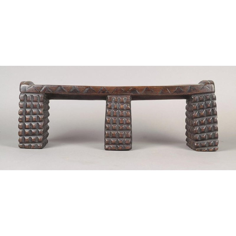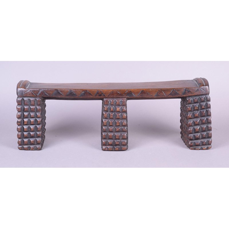wood, with a raised ribbed end top and chevron edge, on three amasumpa carved supports,