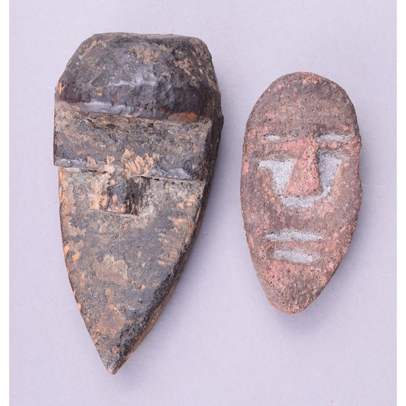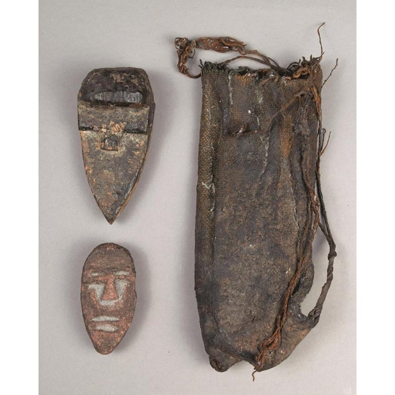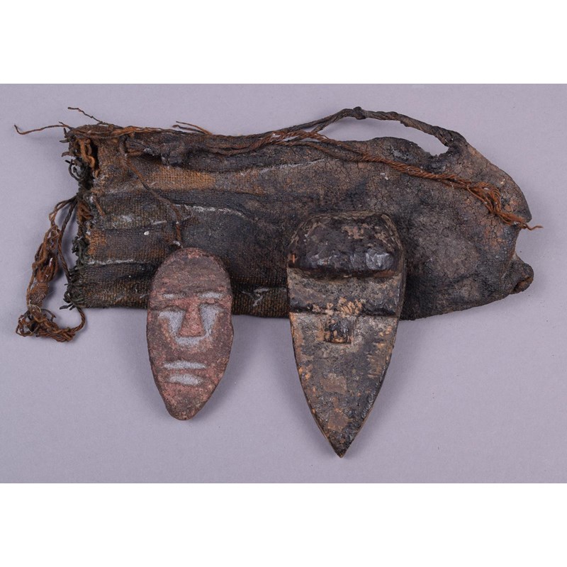 with a cloth and fibre bag and a stone passport mask. (3)