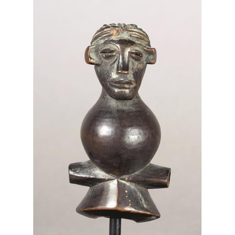 wood, with a head having a diced and linear coiffure, the neck pierced for attachment, a spherical body and flared mouthpiece,