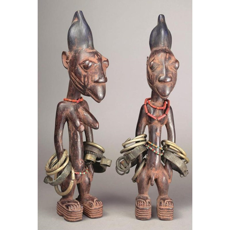 wood, brass, beads, male and female with lobed coiffures, face scarifications and wearing sandals on ribbed platforms, with beads, bands and brass bangles,