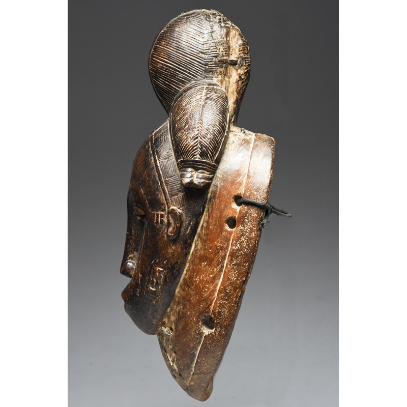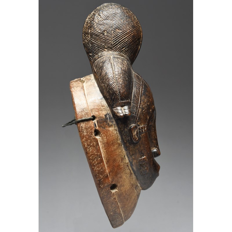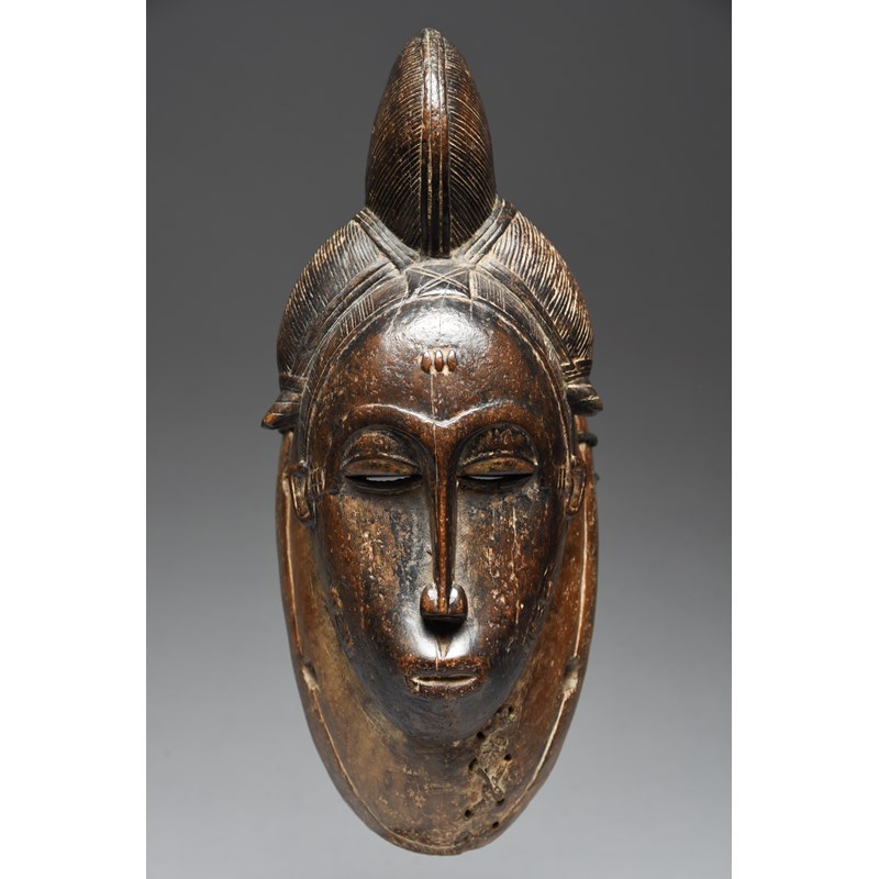 with a linear carved coiffure and raised scarification to the forehead, temple and cheeks, traces of white pigment to the eyes and mouth, the face with worn black pigment, leather and metal staple native repairs,