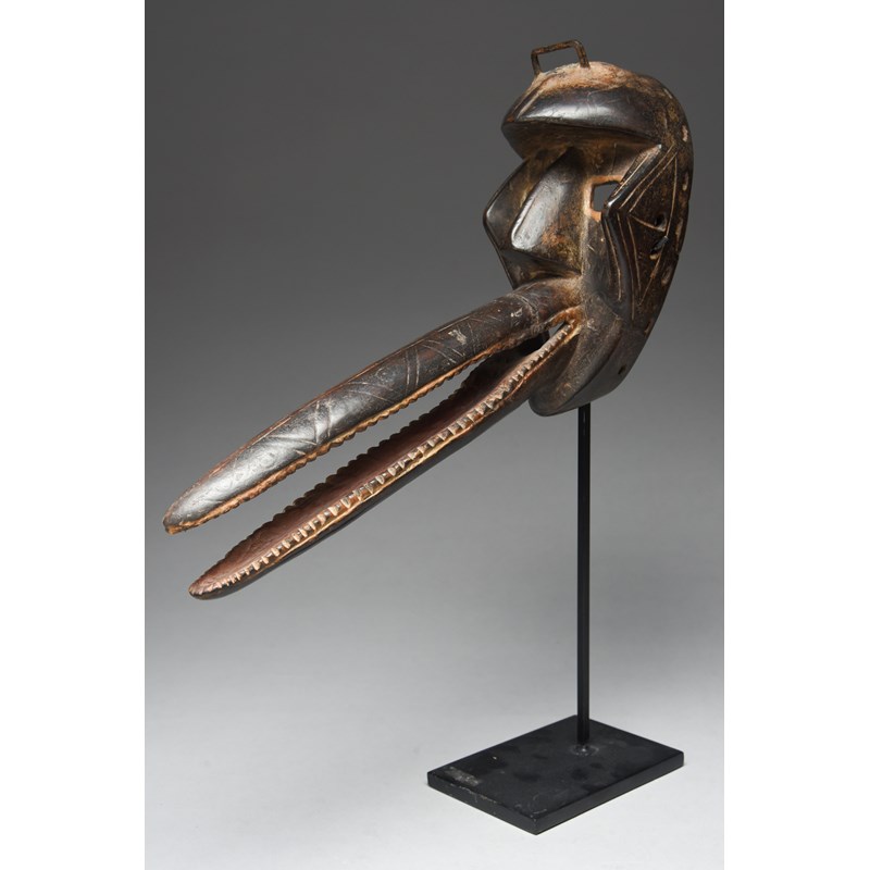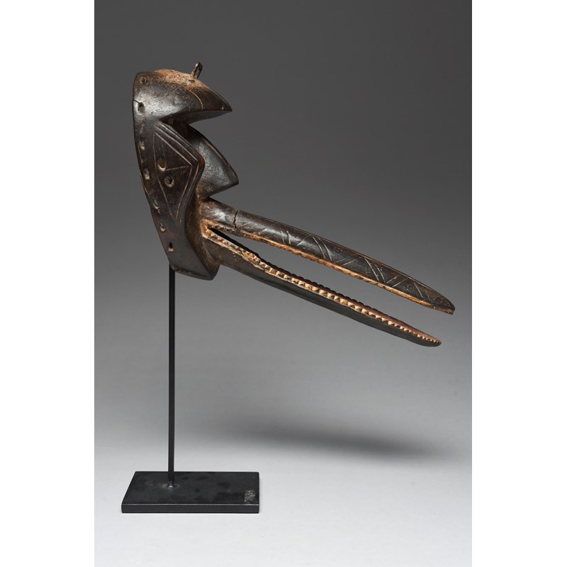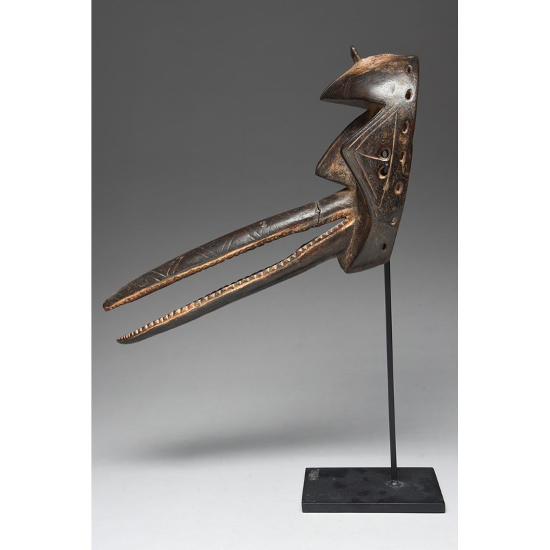 with a metal hoop to the head in a pigment mound, with a large beak having red and white pigment,