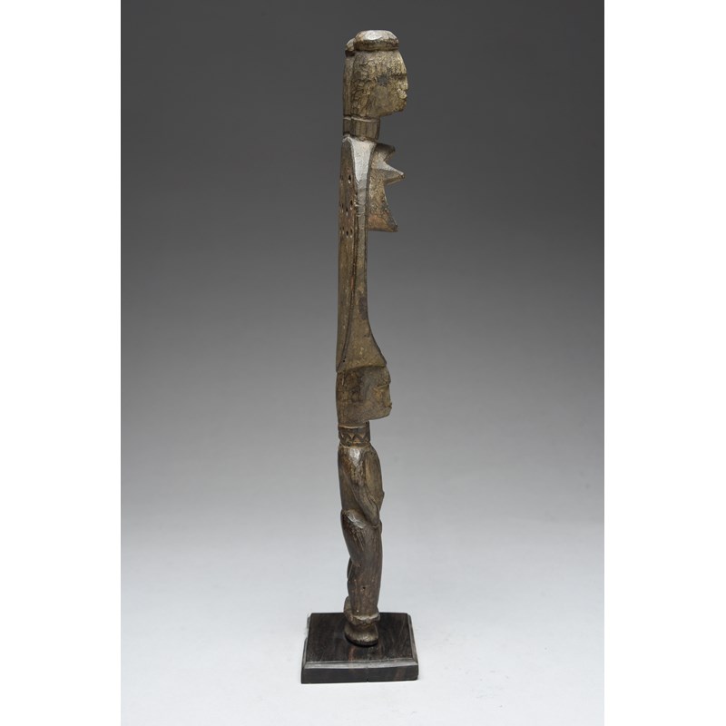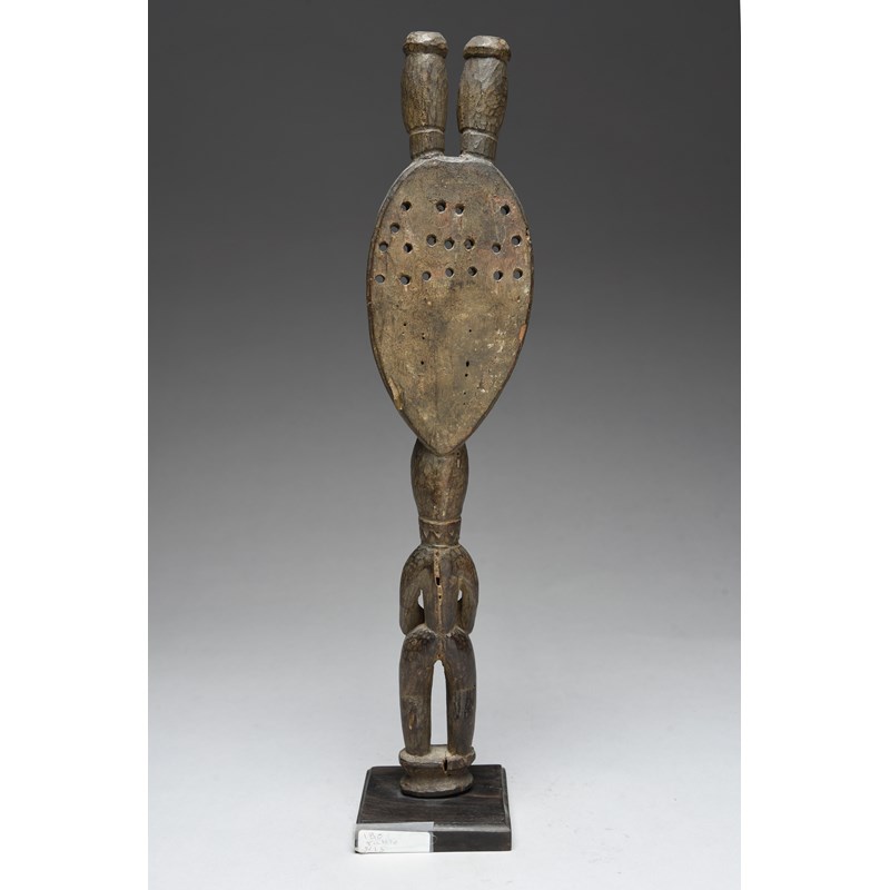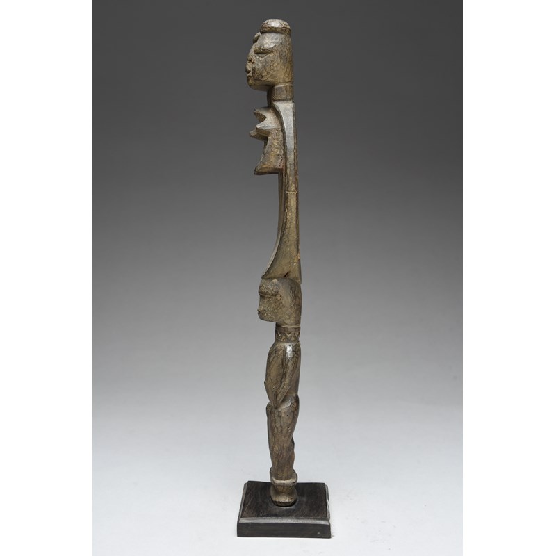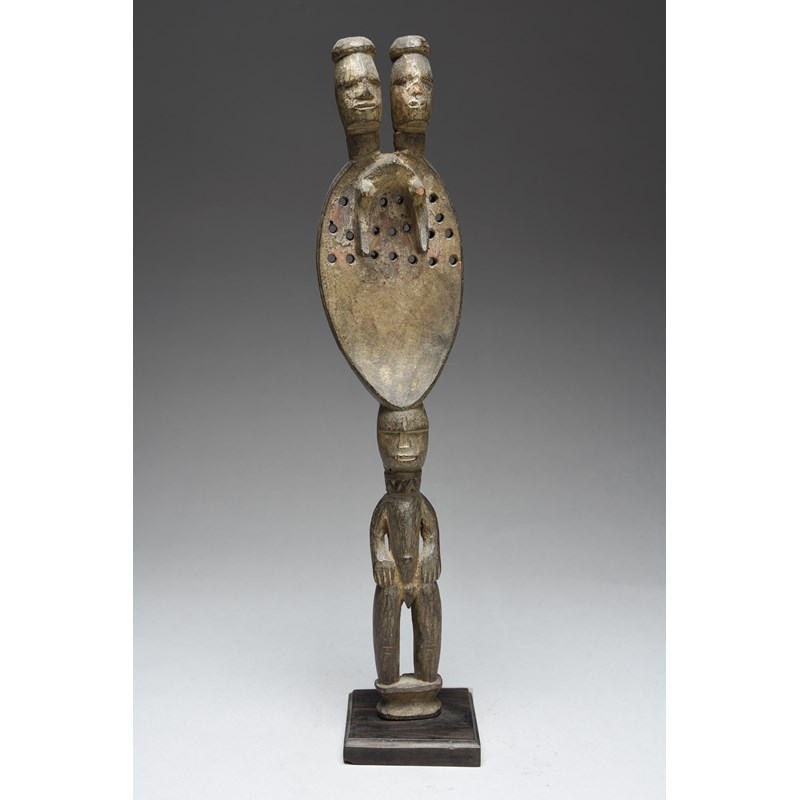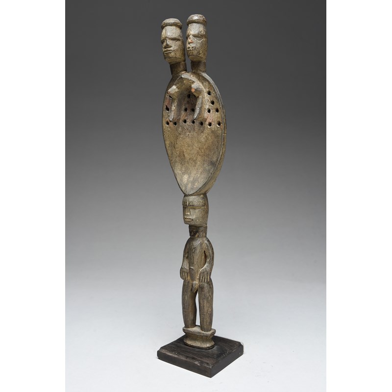 with a standing male handle with a flat part pierced blade with stylised female body and a pair of heads above,