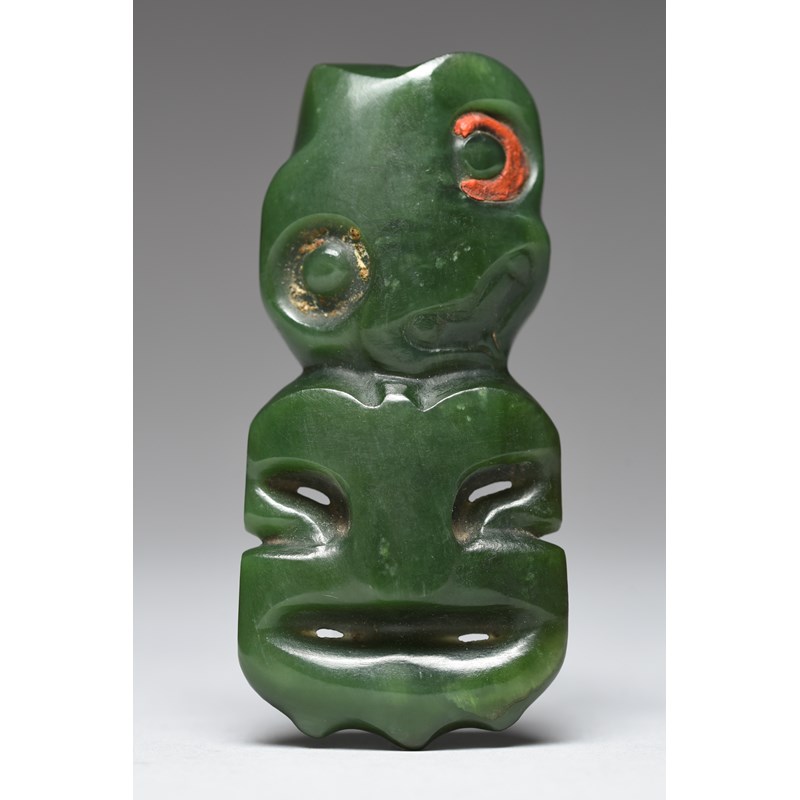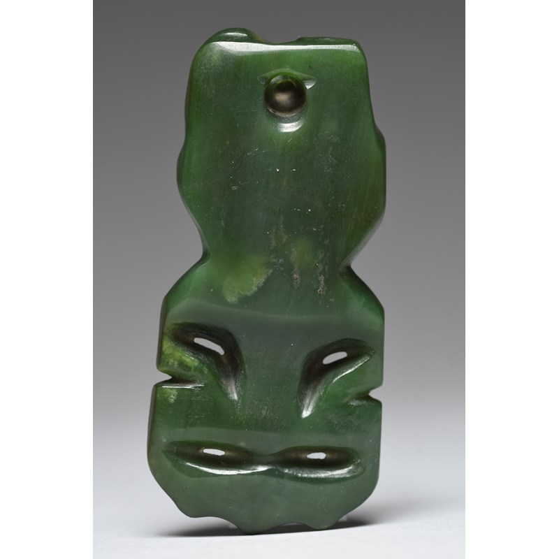 nephrite, with a tilted head with red sealing wax to the left eye and with the hands on the thighs, with attachment hole through the top and the back of the head,