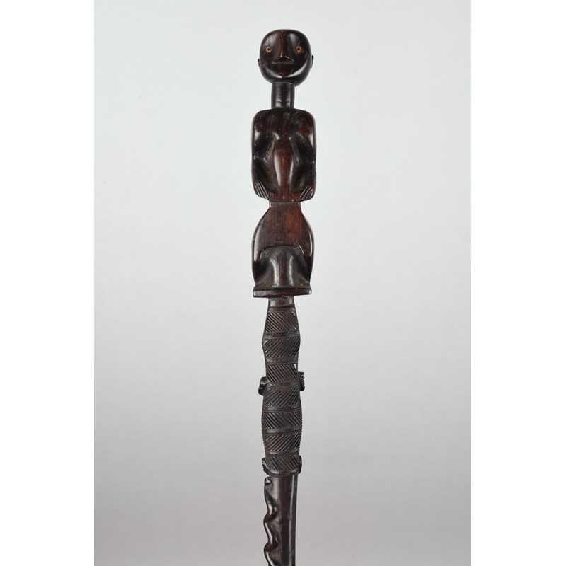 with a carved standing figure terminal with inset bone disc eyes, above a crocodile and two entwined snakes, with a brass tip,