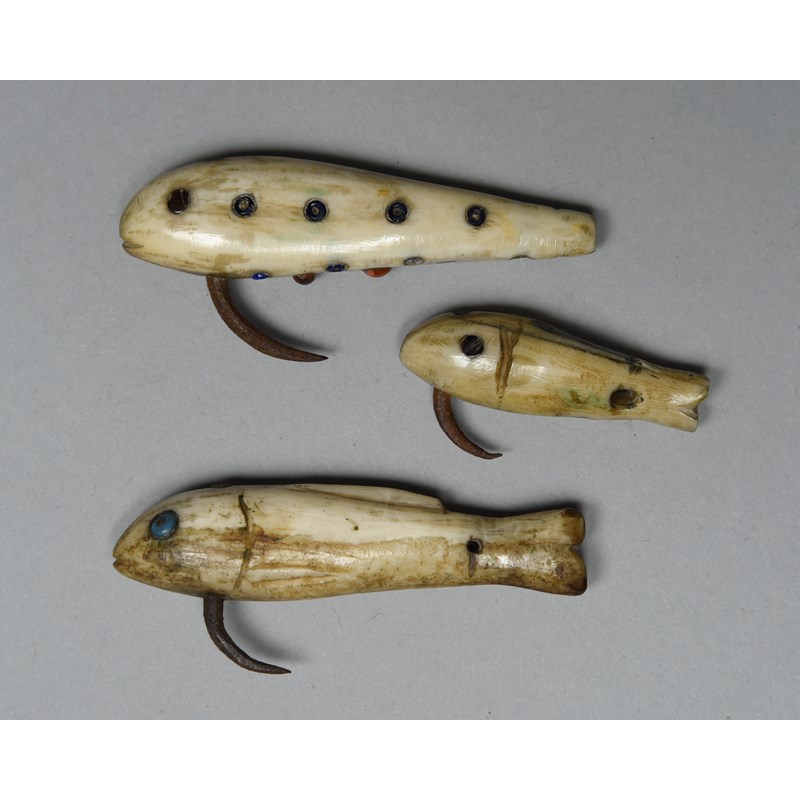 walrus ivory, modelled as fish, inset lead, glass beads and baleen with metal hooks, pierced towards the tails,