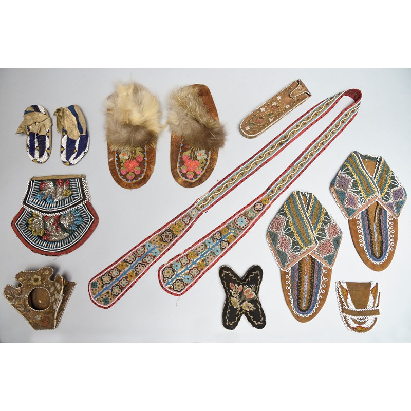 including a Sioux child's pair, hide, beads and ribbon, 12cm long, a Cree pair with fur ankles, 22cm long and a Maliseet pair with open beadwork, 23cm long, three Micmac quillwork pieces: pin cushion, watch case and spectacle case, an Iroquois purse, another smaller and a Maliseet floral beadwork sash, 125cm long. (12)