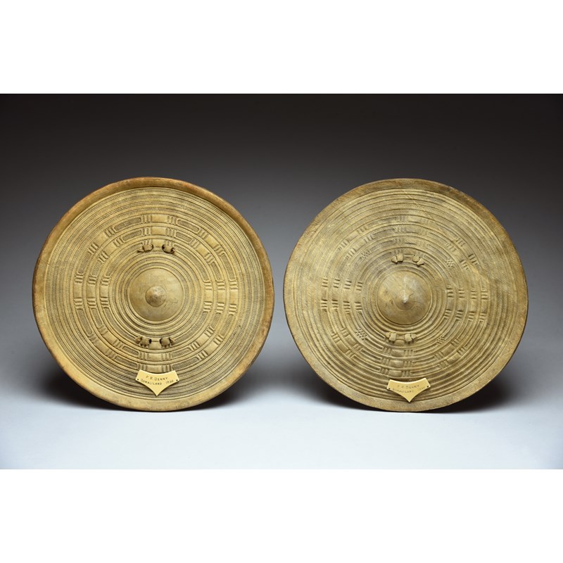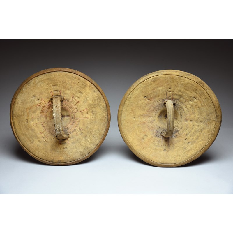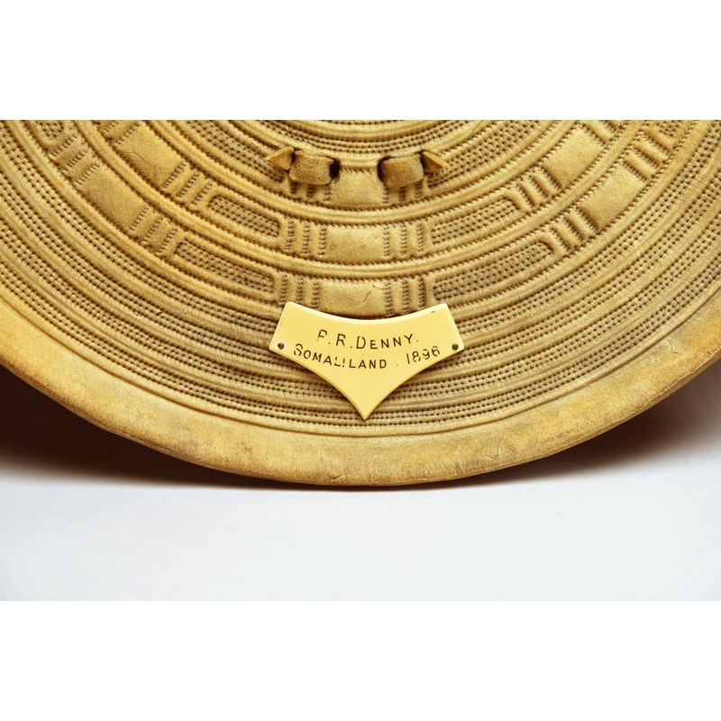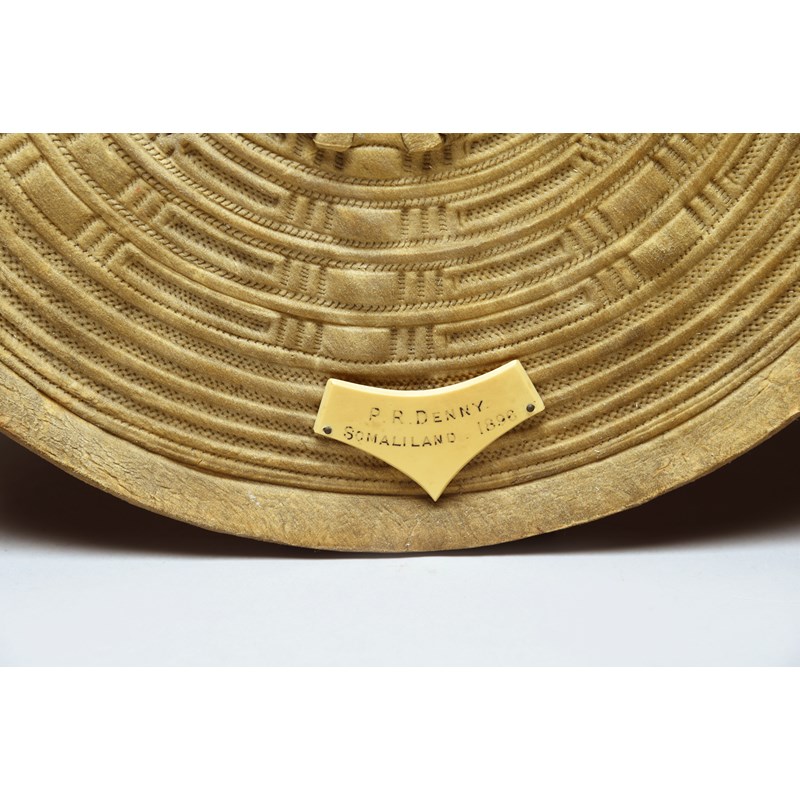 hide with ribbed and incised decoration, with hide handles, one with a cloth binding, both with red and black pigment geometric decoration to the back and with an ivorene plaque to the front inscribed P. R. DENNY. SOMALILAND. 1896,