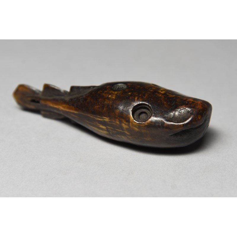 marine ivory, carved as a fish with counterweight holes and pierced at the front sides,