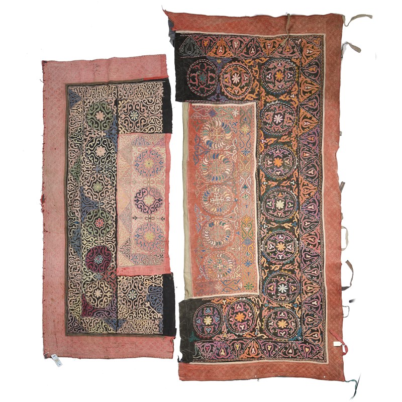 velvet and cotton, with embroidered borders and applique panels of foliage, roundels and scrolls, one with applied straps along the top edge,