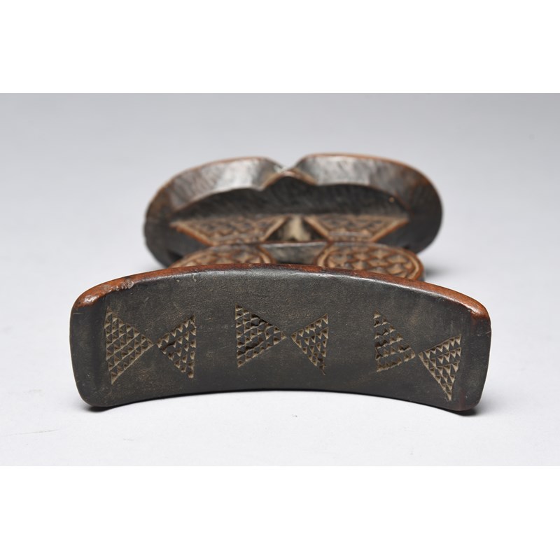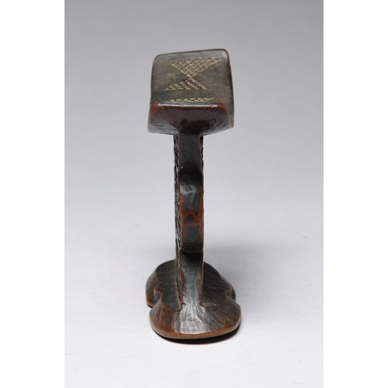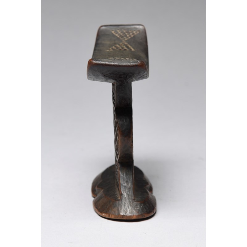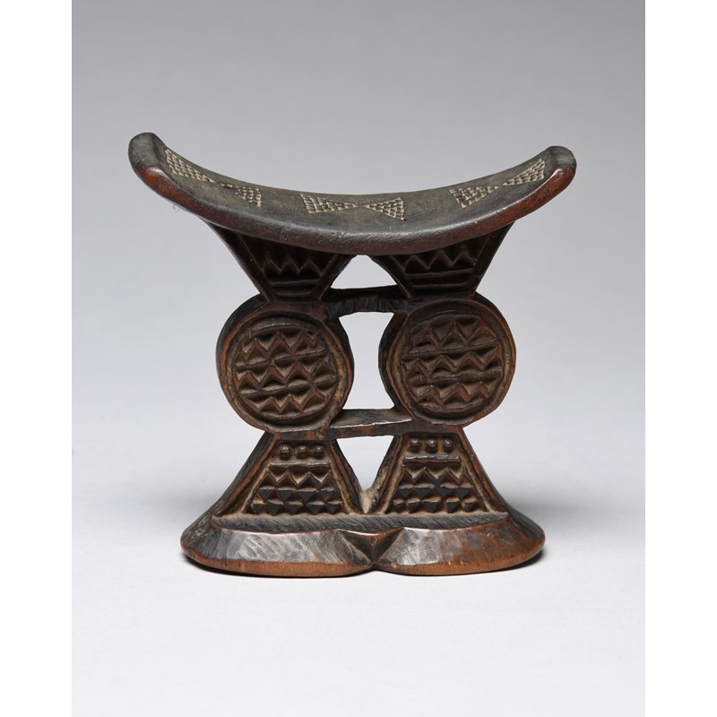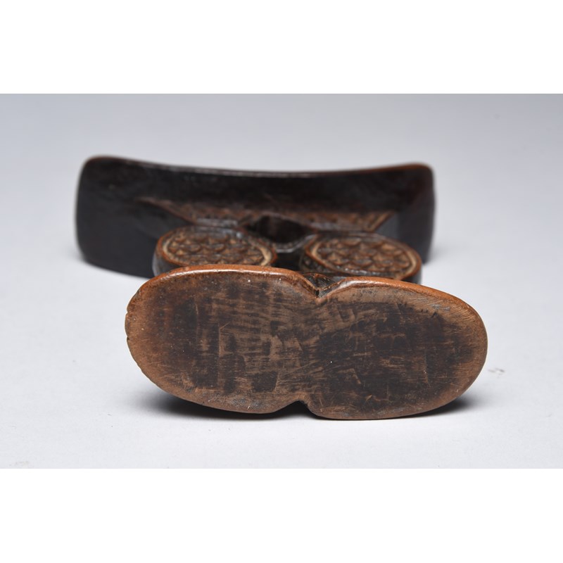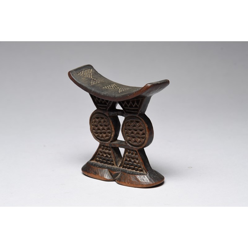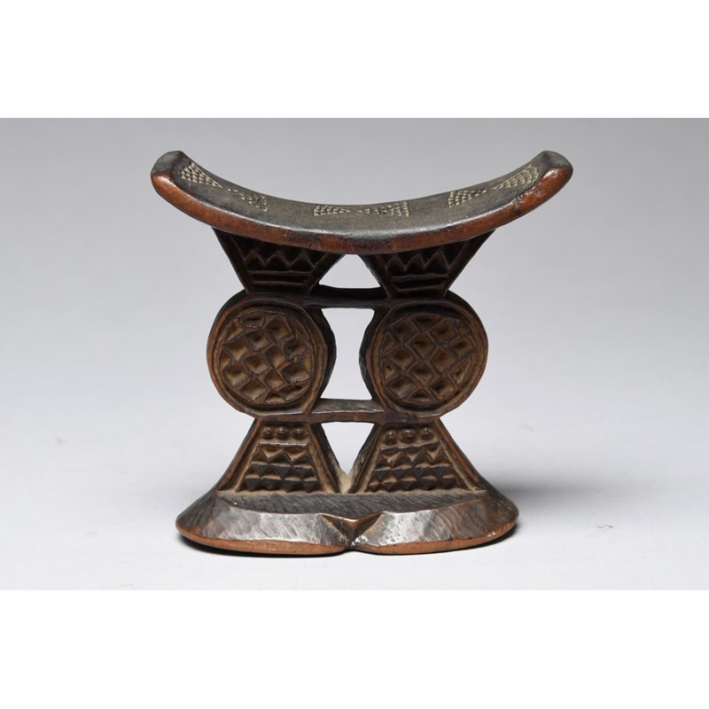 the top with six carved triangles, on an open carved twin support united by two horizontal bars, raised on a notched and waisted oblong base,