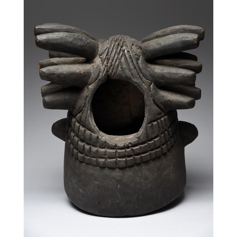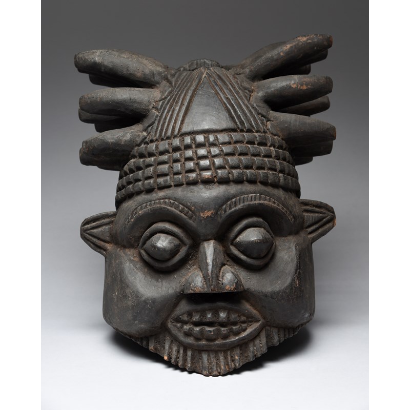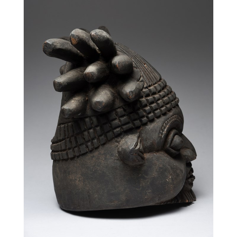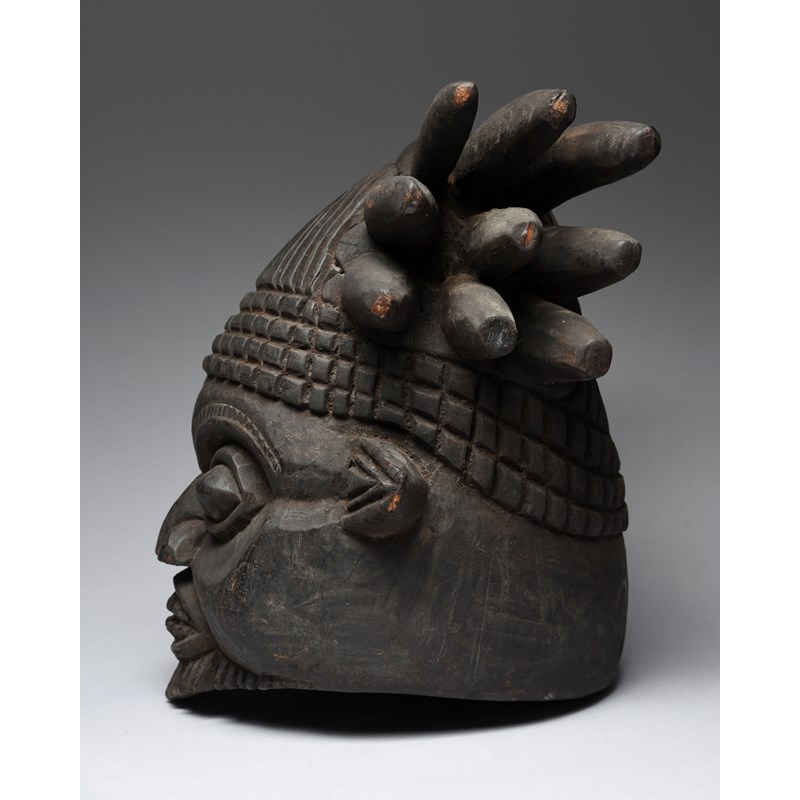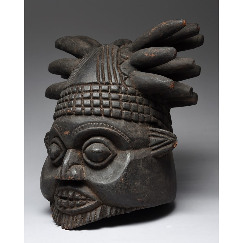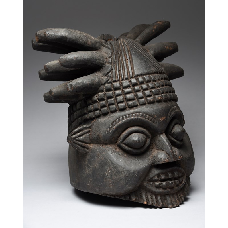 with a spiked and diced coiffure and with an aperture to the top and the back of the head, the face with bared teeth and a beard,