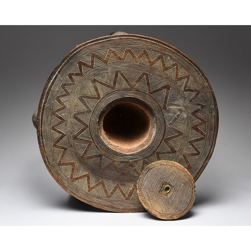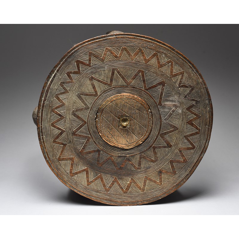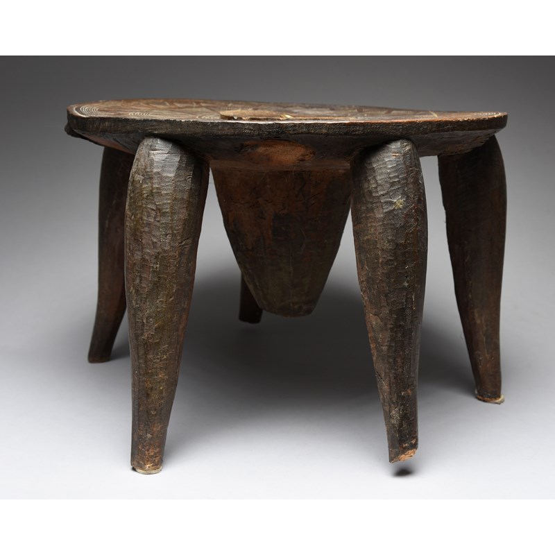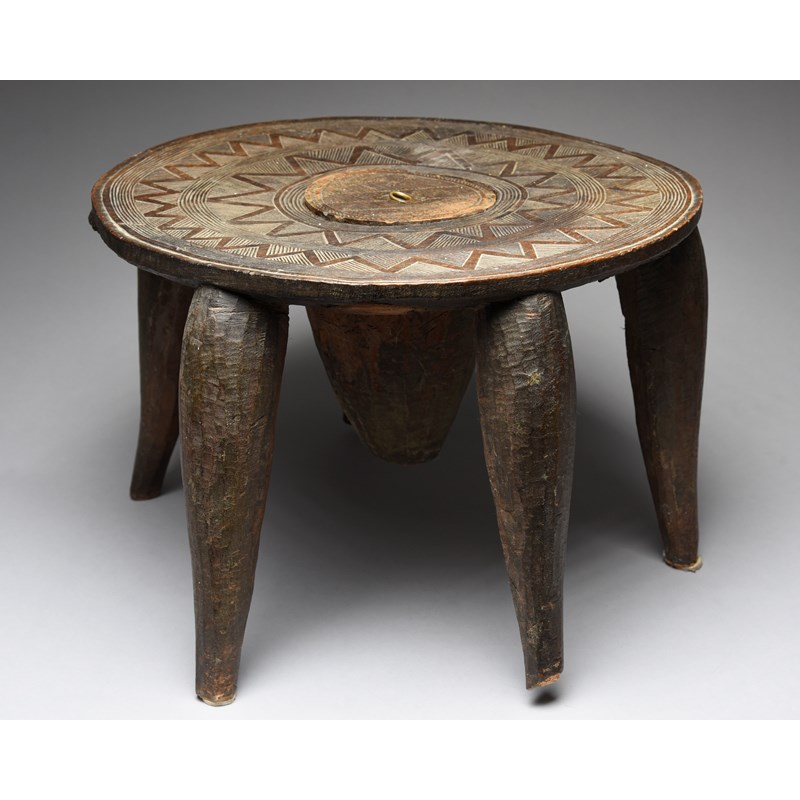the carved top with a central cover with a sunken brass handle revealing a conical void, on five legs, seven missing,