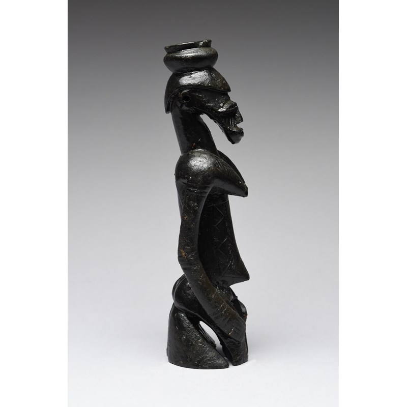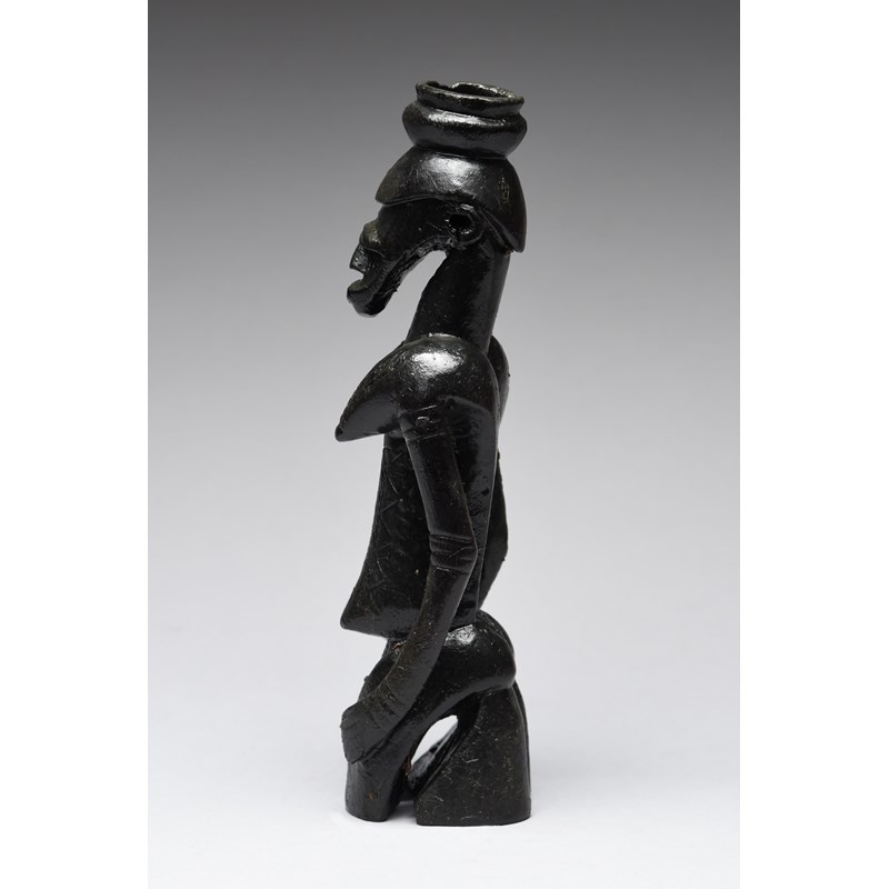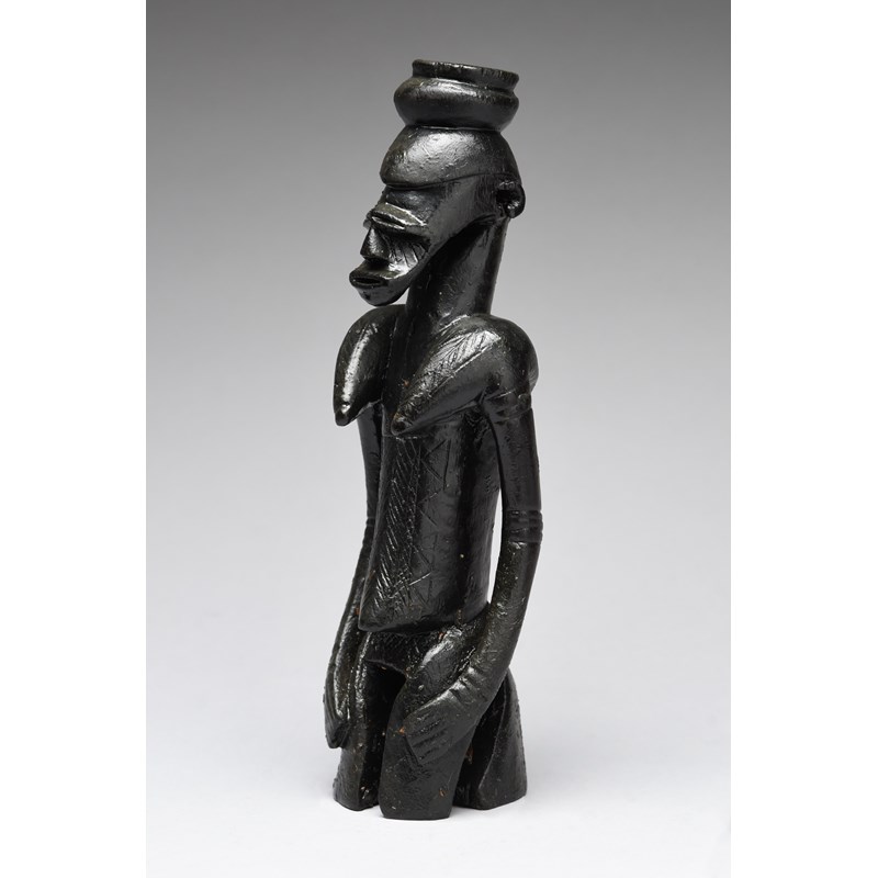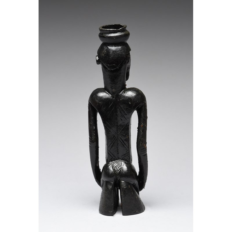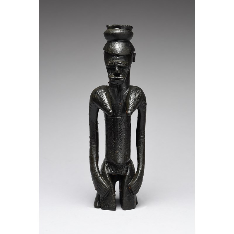 seated with a small bowl on her head, with facial and body scarifications and with her hands resting of her thighs, with a thick oiled patina,