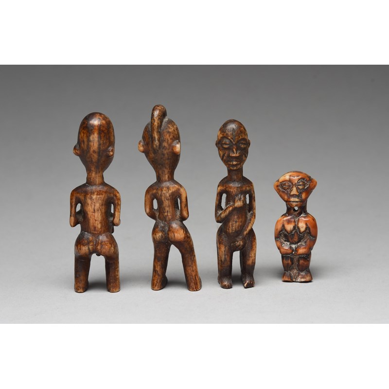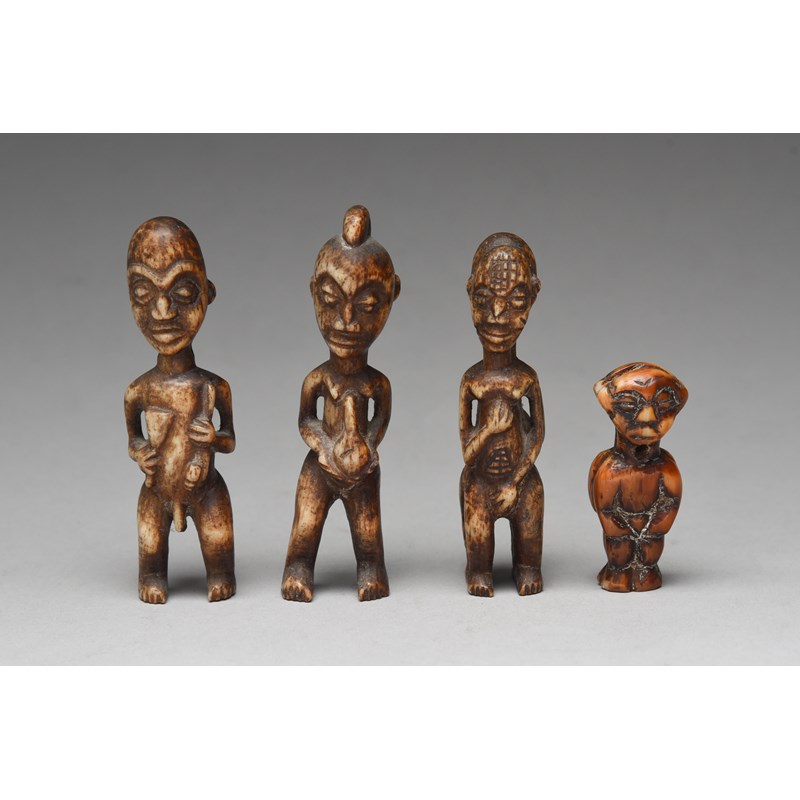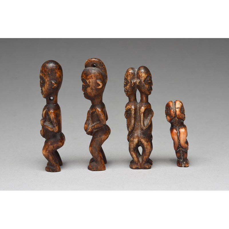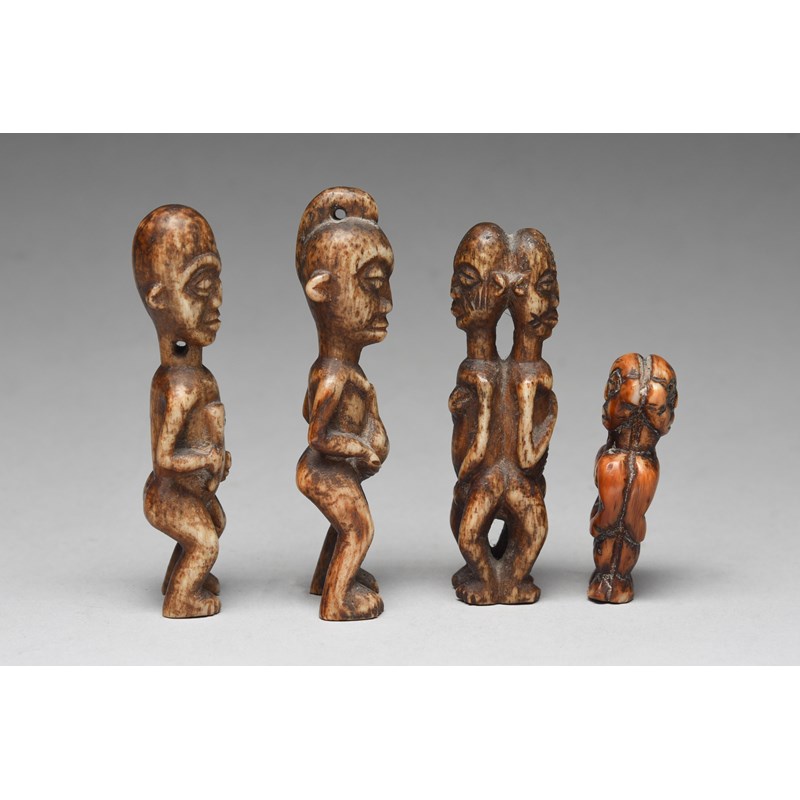 and a pair of Cameroon carved bone female and male figure amulets, 10cm and 9.7cm high and a Cameroon carved bone male and female janus amulet, 9cm high. (4)