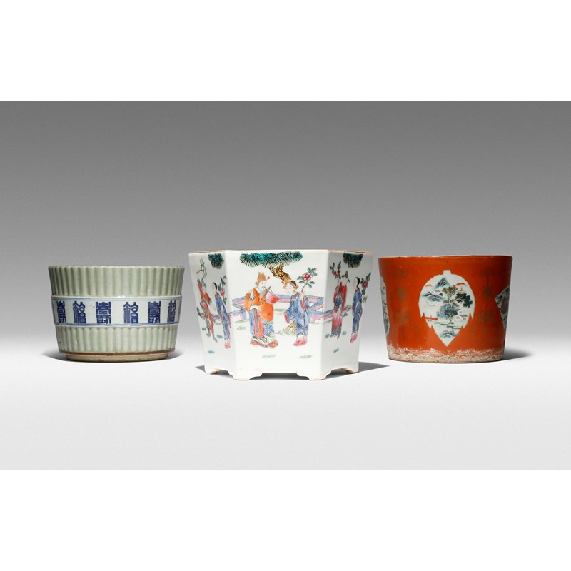 One decorated with a blue and white band of the characters fu shou repeating, the design reserved on a moulded celadon glazed ground, another painted with variously shaped panels enclosing landscapes against a gilt-decorated coral ground, the third of hexagonal section and painted in the famille rose palette with figures in a garden, 25.5cm max. (3)