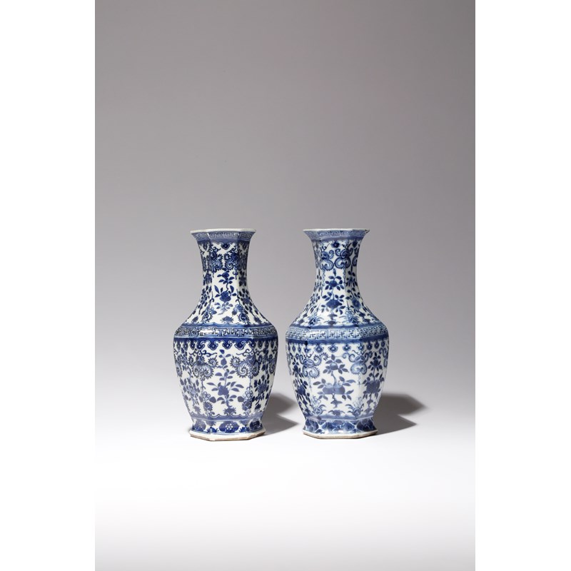 A NEAR PAIR OF CHINESE BLUE AND WHITE HEXAGONAL-SECTION VASES