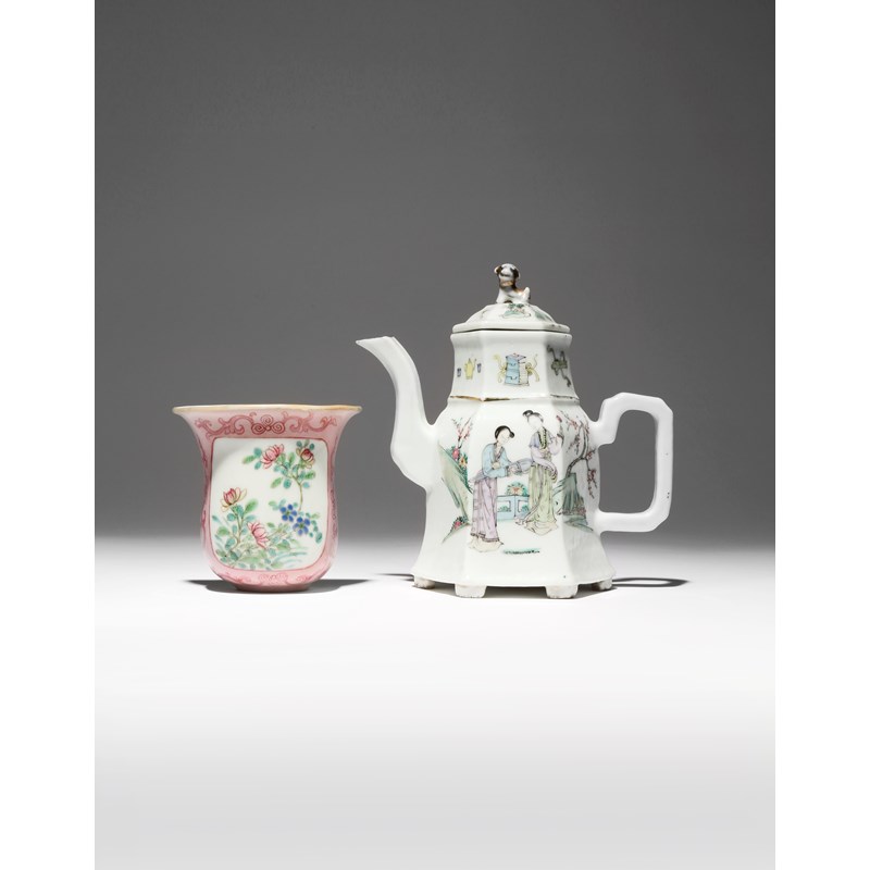 A CHINESE FAMILLE ROSE WALL VASE AND A HEXAGONAL-SECTION TEAPOT AND COVER