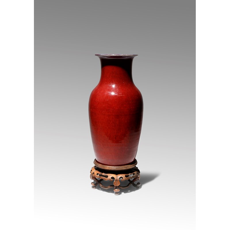 The ovoid body tapering slightly towards the foot and surmounted by a waisted neck, decorated all over with a thick deep red crackled glaze, with streaks and flecks of lavender encircling the rim, the base with a thin brown wash, together with a wood stand, 37.5cm. (2)