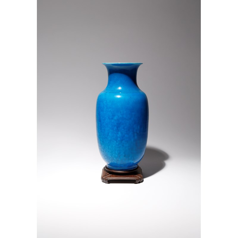 The ovoid body surmounted by a short waisted neck, decorated all over with a vibrant turquoise crackled glaze, together with a wood stand, 34.5cm. (2)