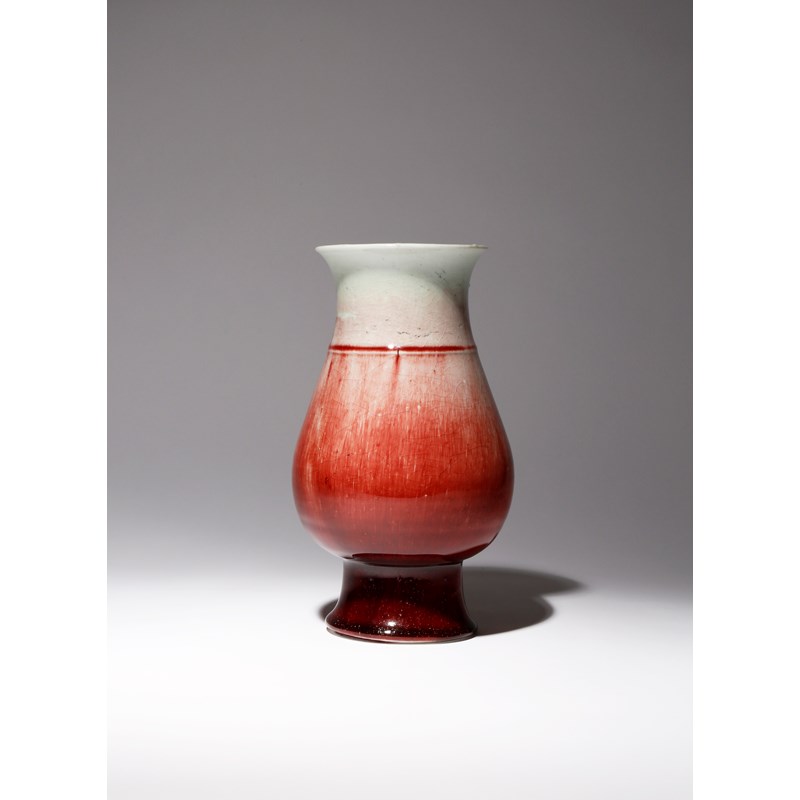 The body supported on a tall spread foot and rising to a flared rim, decorated with a crackled flambe glaze draining from the rim, the rim left white and gradually deepening to a dark red at the foot, 27.7cm.