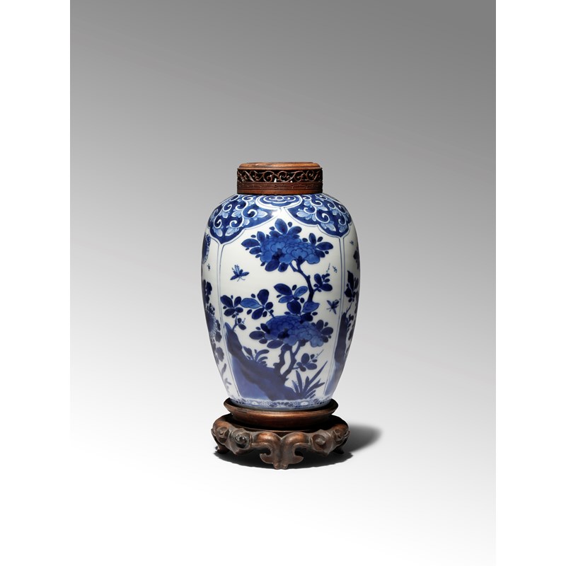 Painted with four large panels enclosing insects in flight around sprays of chrysanthemum, peony, prunus and camellia, all below a complex band of ruyi-heads, together with a wood stand and reticulated wood cover, 18.5cm. (3)