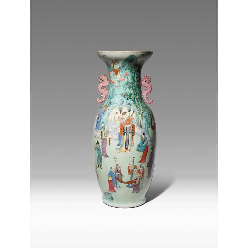 Brightly painted with a continuous scene of many heavenly figures in a mountainous paradise, the deities including Shoulao, the Hehe Erxian and Liu Hai, with two pink-enamelled applied handles shaped as archaistic beasts flanking the neck, 61cm.