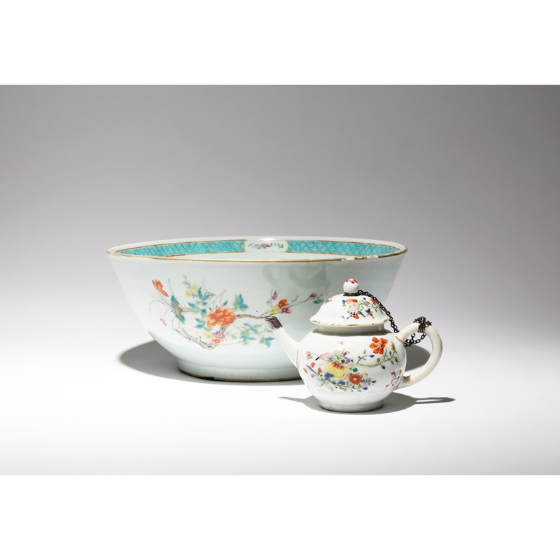 A LARGE CHINESE FAMILLE ROSE BOWL AND A TEAPOT AND COVER