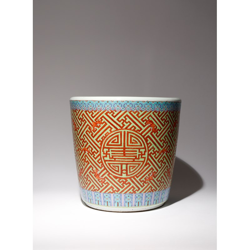 Painted in iron-red enamel with large shou medallions surrounded by bats on a complex geometric ground with fylfot motifs, all reserved on a pale lime-green ground, the design contained between bands of ruyi-heads and lappets encircling the rim and foot, 40cm dia.