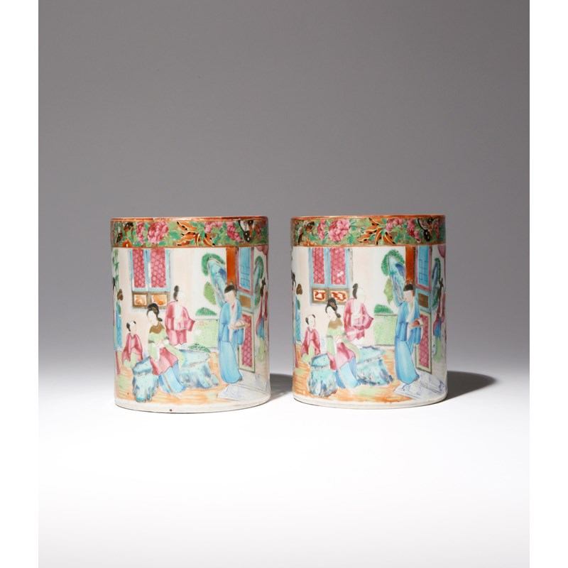 A PAIR OF CHINESE CANTON FAMILLE ROSE CYLINDRICAL BRUSHPOTS