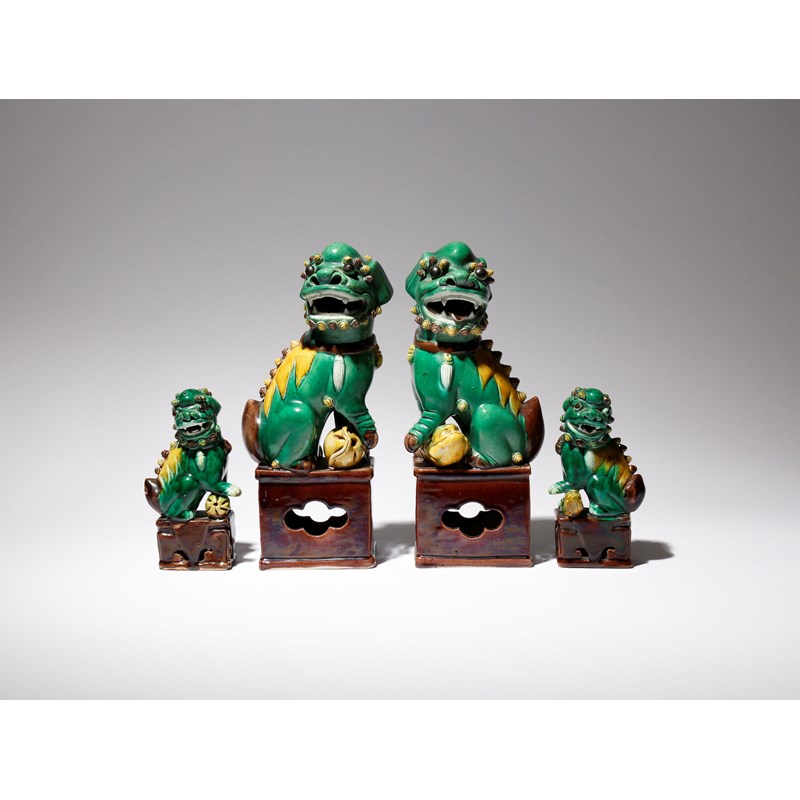 Each beast depicted seated upon a pierced rectangular-section pedestal, two with their paw resting on a brocade ball, the others with their paws on their pups, each staring with bulging eyes and its mouth open wide, 25.2cm max. (4)