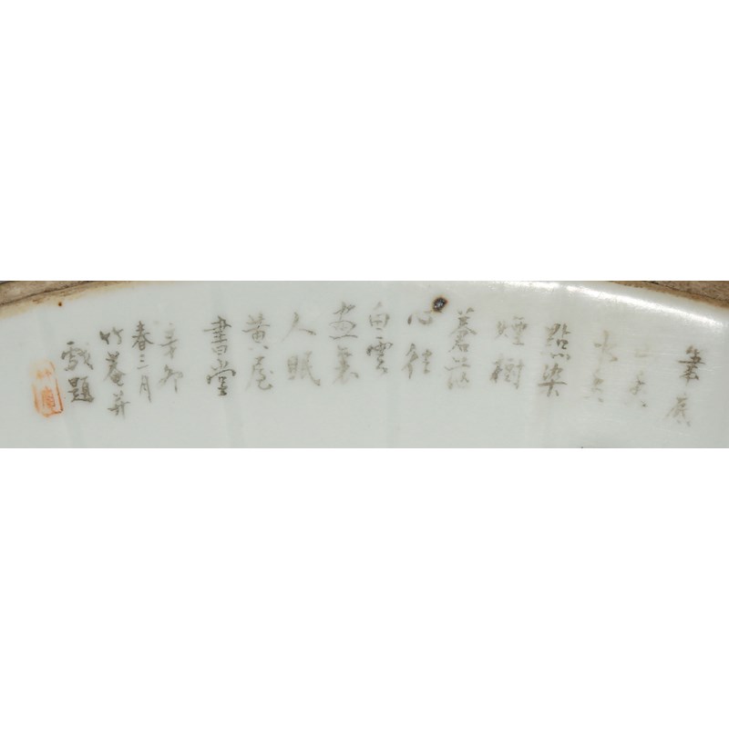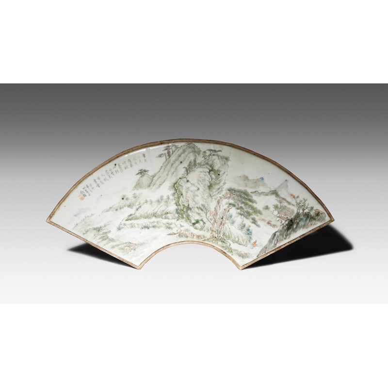A CHINESE ENAMELLED PORCELAIN FAN-SHAPED 'LANDSCAPE' PLAQUE