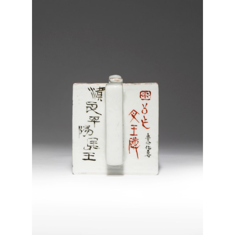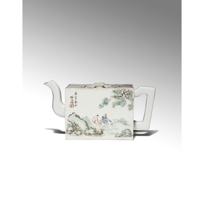 Painted to one facet with two figures seated amidst rocks and pine, with a rural landscape scene to the reverse, the handle flanked by lines of calligraphy, the top and cover painted with a branch of flowering pink blossoms, signed Cheng Huanwen and dated autumn of the gengyin year, 17.5cm. (2)