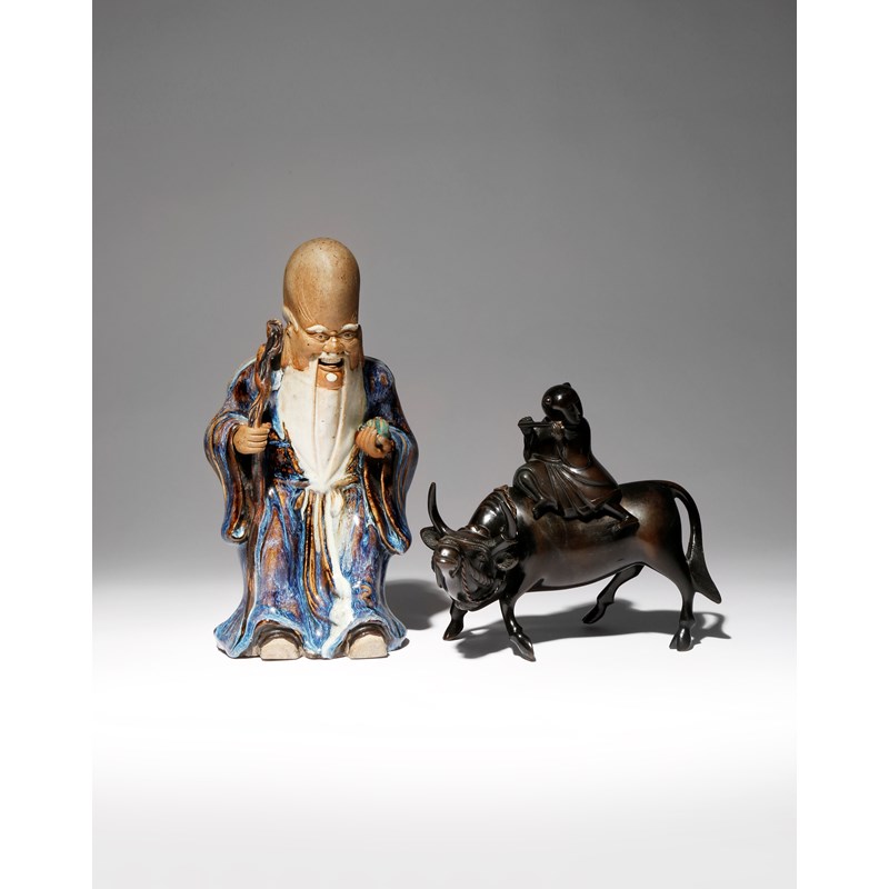 The God of Longevity depicted holding his staff and a peach, with a vibrant purple glaze with lavender streaks decorating his robe, his head and hands left unglazed, the incense burner shaped as a water buffalo, the cover formed as a seated boy playing the flute, his hair tied in two buns, 27.8cm and 20.5cm, the incense burner and cover 1kg. (3)