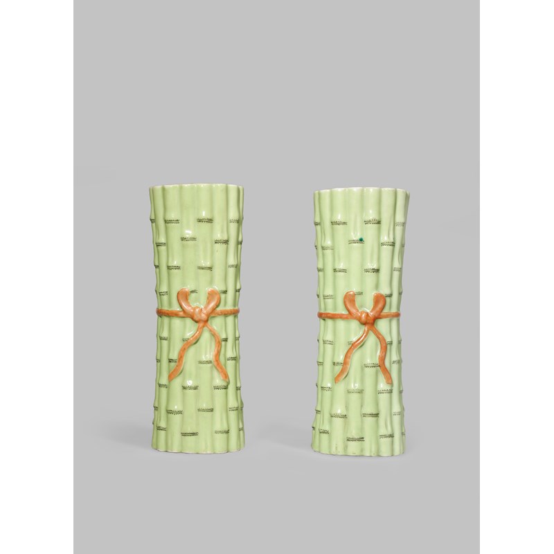 Each moulded as a bundle of green bamboo stems tied together with an iron-red and gilt-decorated ribbon, together with a fitted silk box, 20.2cm. (2)