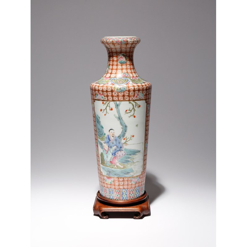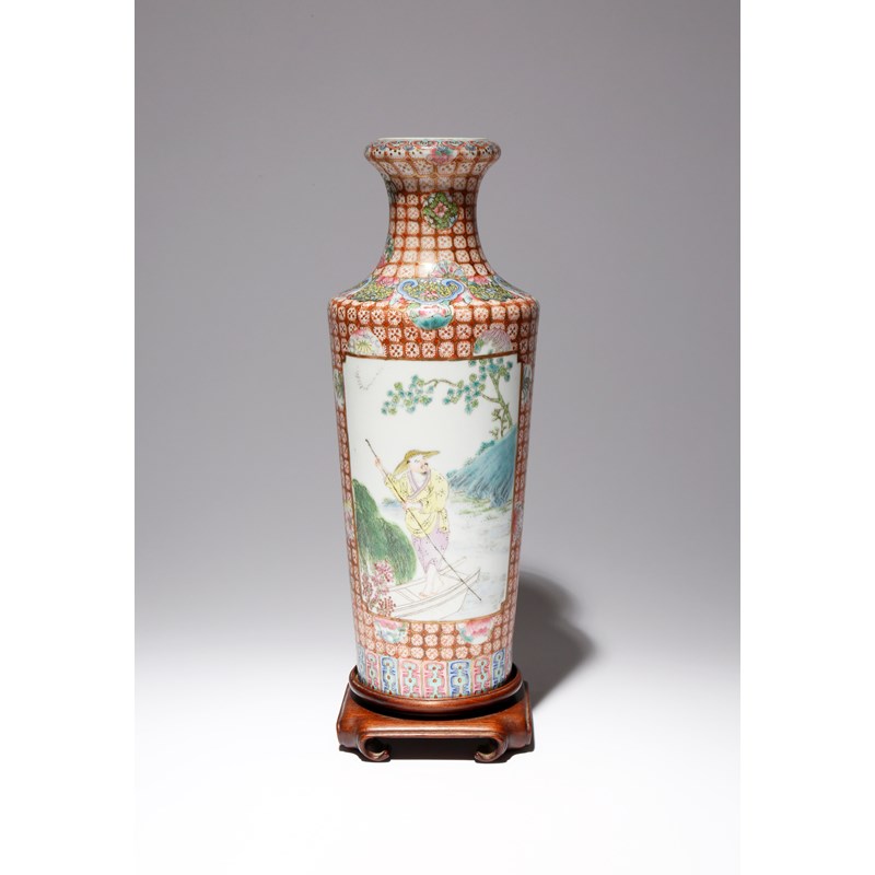 Painted with two large panels containing a figure on a sampan and a boy fishing in a river with his father, the scenes surrounded by smaller roundels enclosing lotus, chrysanthemum, peony, orchids and other flowers, all reserved on an iron-red and gilt-decorated geometric ground, the base drilled through the mark, together with a wood stand, 33.8cm. (2)