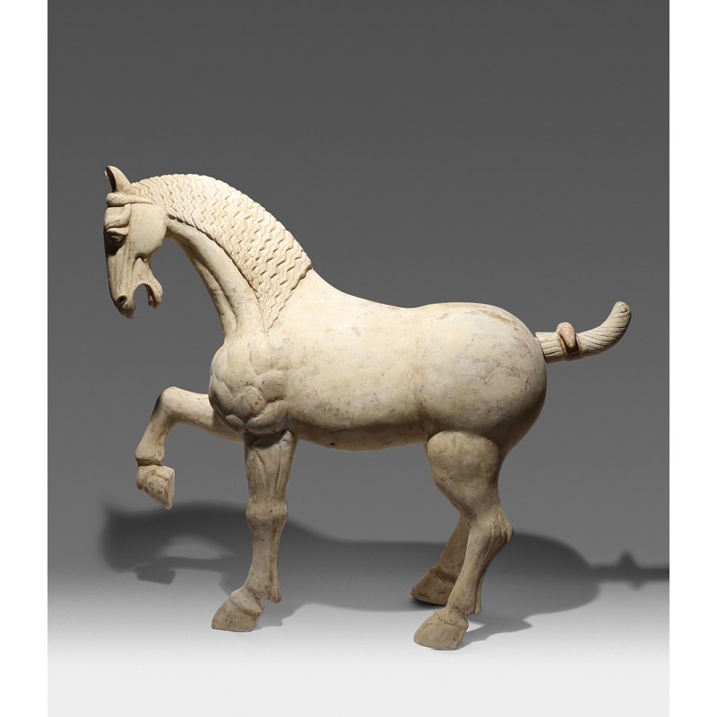 The horse depicted standing proud on three legs as it raises its front right leg dramatically, with its mouth agape and nostrils flaring, its strong body defined with its muscles, with traces of black and red pigment to the surface, its tail removable, 80cm. (2)