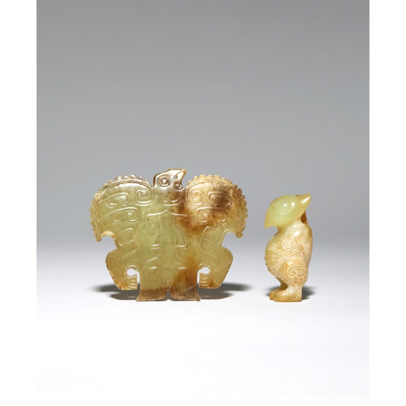 清(可能) 黃玉雕仿古鳥及鷹型佩 一組兩件