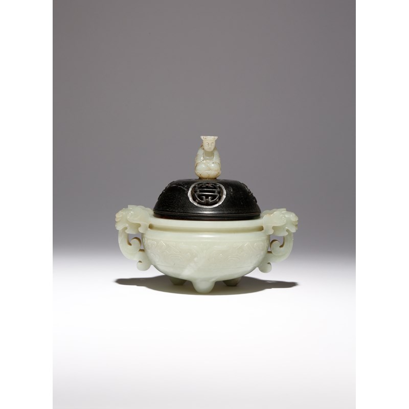 Carved to the exterior with a band of archaistic taotie masks, the body flanked by two handles issuing from the mouths of mythical beasts, the stone with some russet inclusions, together with a wood cover pierced with medallions and surmounted by a seated figure, all raised on three tapering feet, 10.8cm dia, 16cm max. (2)