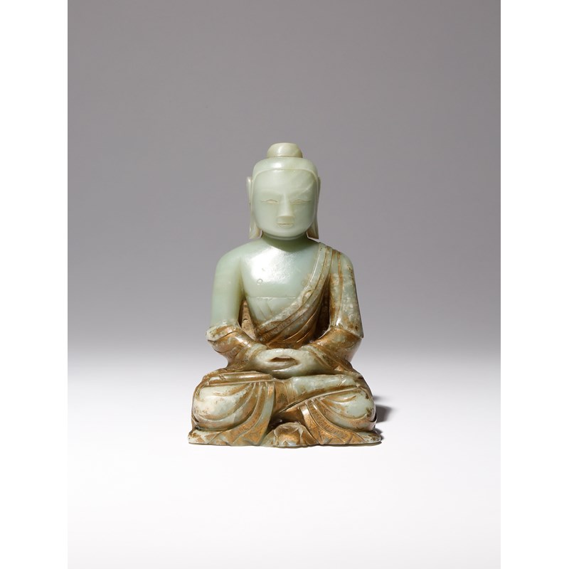 Carved seated in dhyanasana with his hands in dhyana mudra, his robes picked out in gilt and decorated with blossoms, the garments draped loosely over his shoulder revealing his bare chest, his sharply defined features framed by his large elongated earlobes, the stone with some white inclusions, 16.8cm.