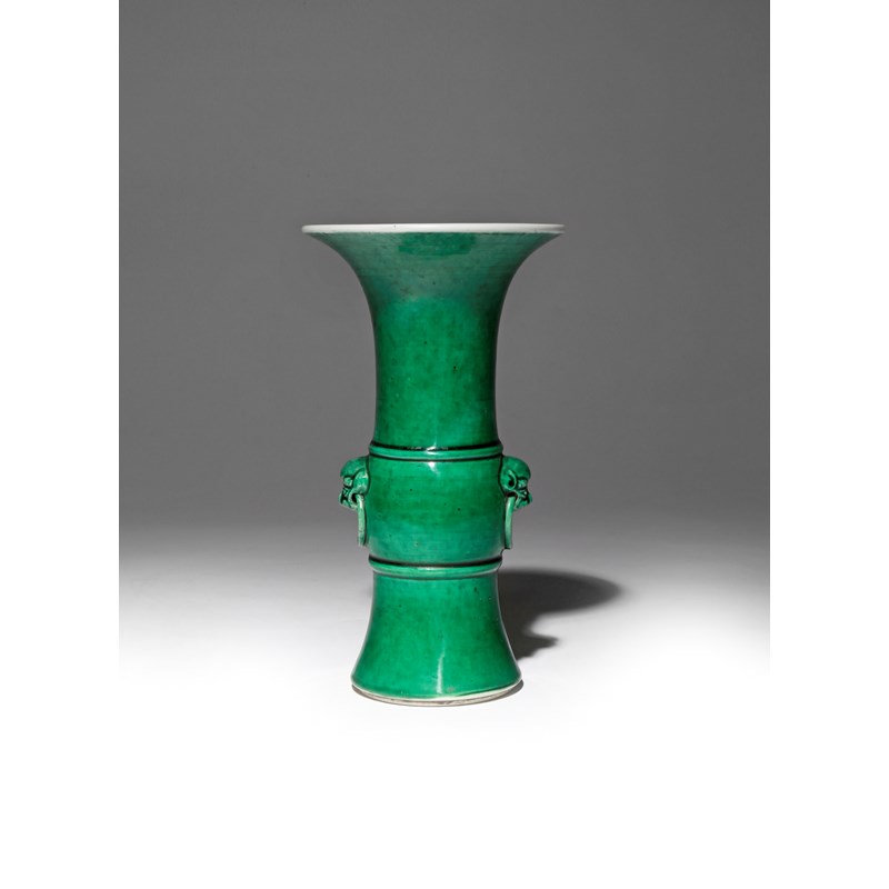Rising from a spread foot to a tall flaring neck, the central section flanked by two applied animal masks suspending rings from their mouths, with a vibrant green glaze decorating the body, the rim left white, with the reign mark incised to the base, 18cm.