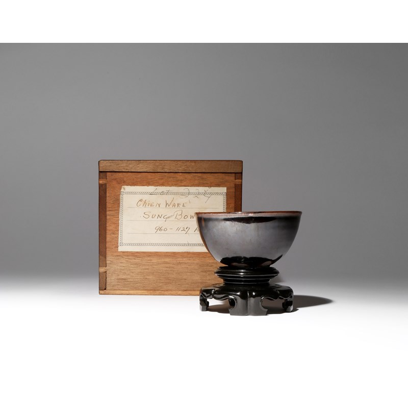 The deep rounded sides decorated in a thick black glaze which stops short of the foot, the glaze at the everted rim of a warm brown tone, the well with an old paper label reading 'CH 59', together with a lacquer stand, all contained in a fitted Japanese wood box and cover, 10cm dia. (2)