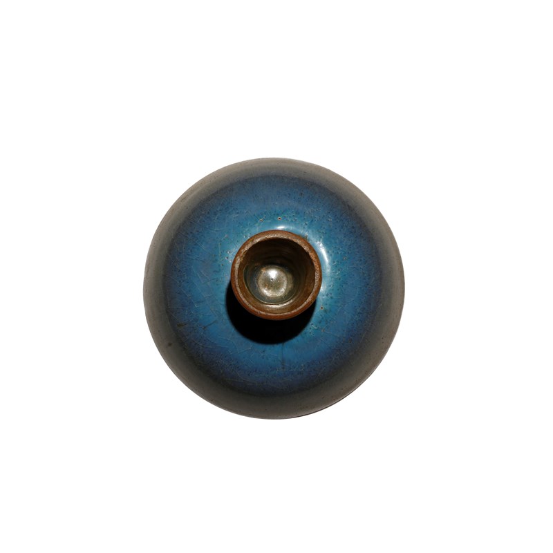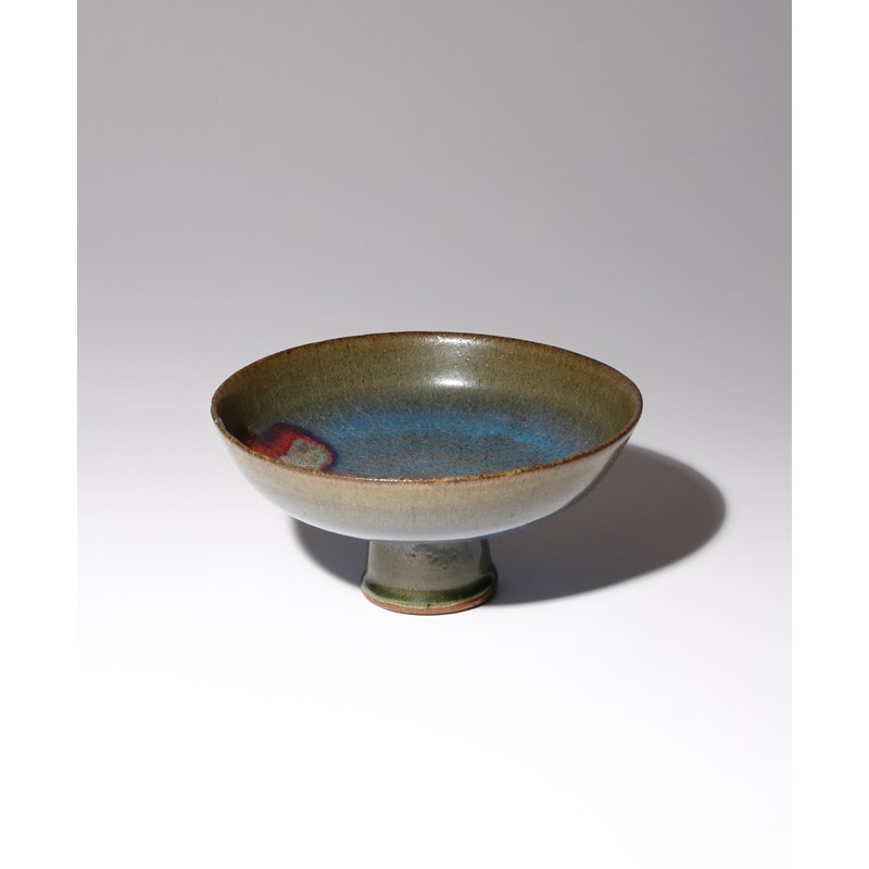 The shallow bowl raised upon a flaring foot, decorated in a pale crackled lavender-blue glaze, with a dramatic magenta splash to the interior, the glaze thinning to a greyish-green around the rim and foot, 16.6cm dia.