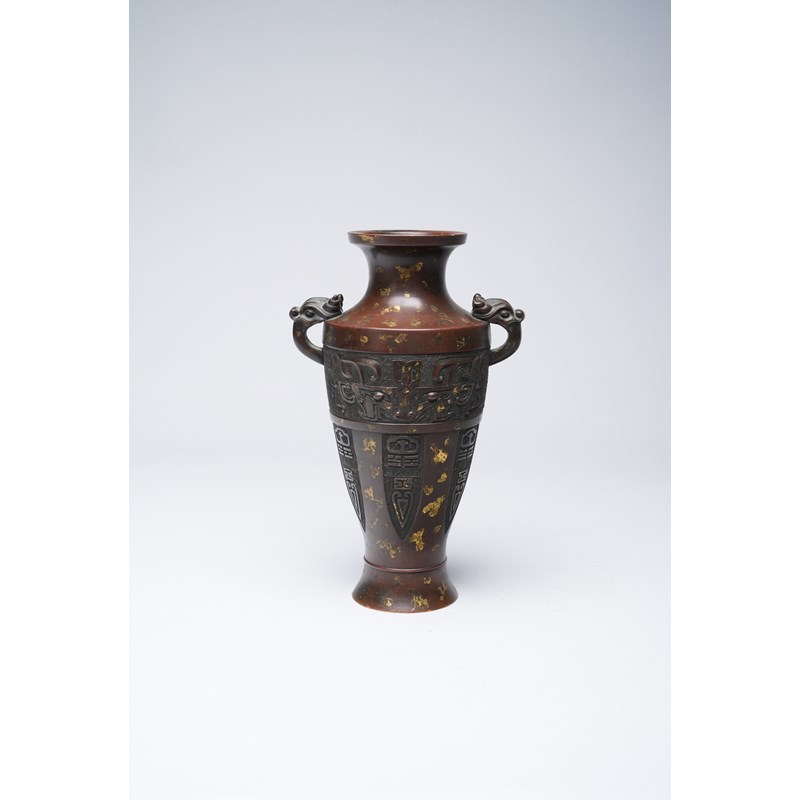 The tall baluster body with a warm brown patina decorated with irregular gold splashes, the shoulder applied with two animal-mask loop handles above a band enclosing two taotie masks and cicada-shaped lappets on a leiwen ground, with a six-character Xuande mark to the base, with a paper label for the Finer Collection 'CB 72', 1.8kg, 27.3cm.
